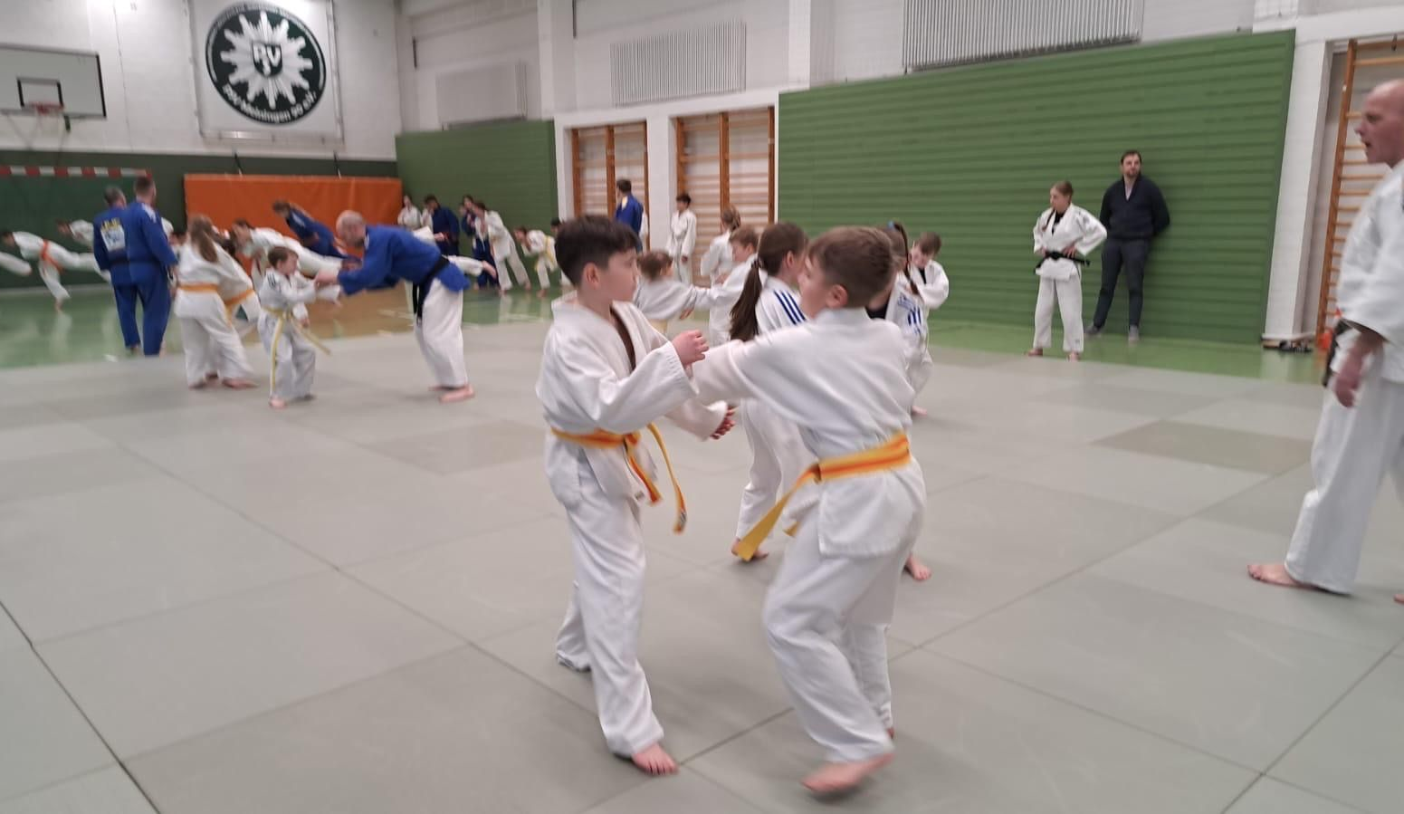 Nach einer aktivierenden Erwärmung auf einer großen Matte, trainierten die ca. 50 Judoka ihre Kondition. Danach fanden noch einige Kampfeinheiten (Randori) statt, was besonders interessant war, da sich die Judoka diesmal aus anderen Vereinen, und nicht wie im üblichen Training aus dem gleichen Verein gegenüberstanden.